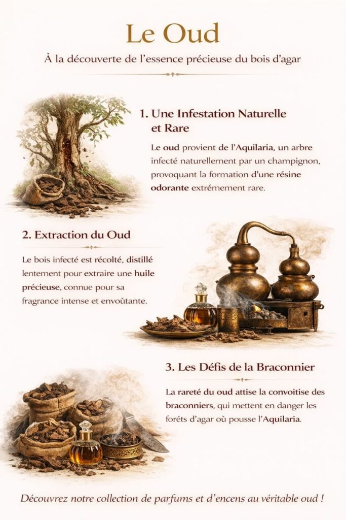 Le oud, parfois appelé bois d’agar, provient de l’Aquilaria, un arbre tropical asiatique. L’arbre produit cette résine précieuse en réaction à une infection fongique naturelle. Cette résine, sombre et parfumée, est ensuite collectée pour être transformée en essence olfactive. Le oud est réputé pour sa fragrance intense, boisée et légèrement sucrée, très prisée dans les parfums de luxe.